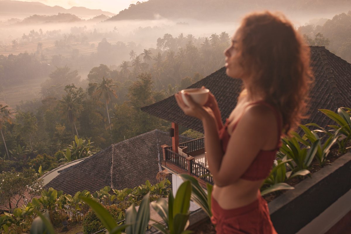 Photo Caption: Woman enjoys a relaxing yoga retreat at a beautiful Bali resort with stunning views of the sunrise and Agung volcano. Travel and wellness concept.